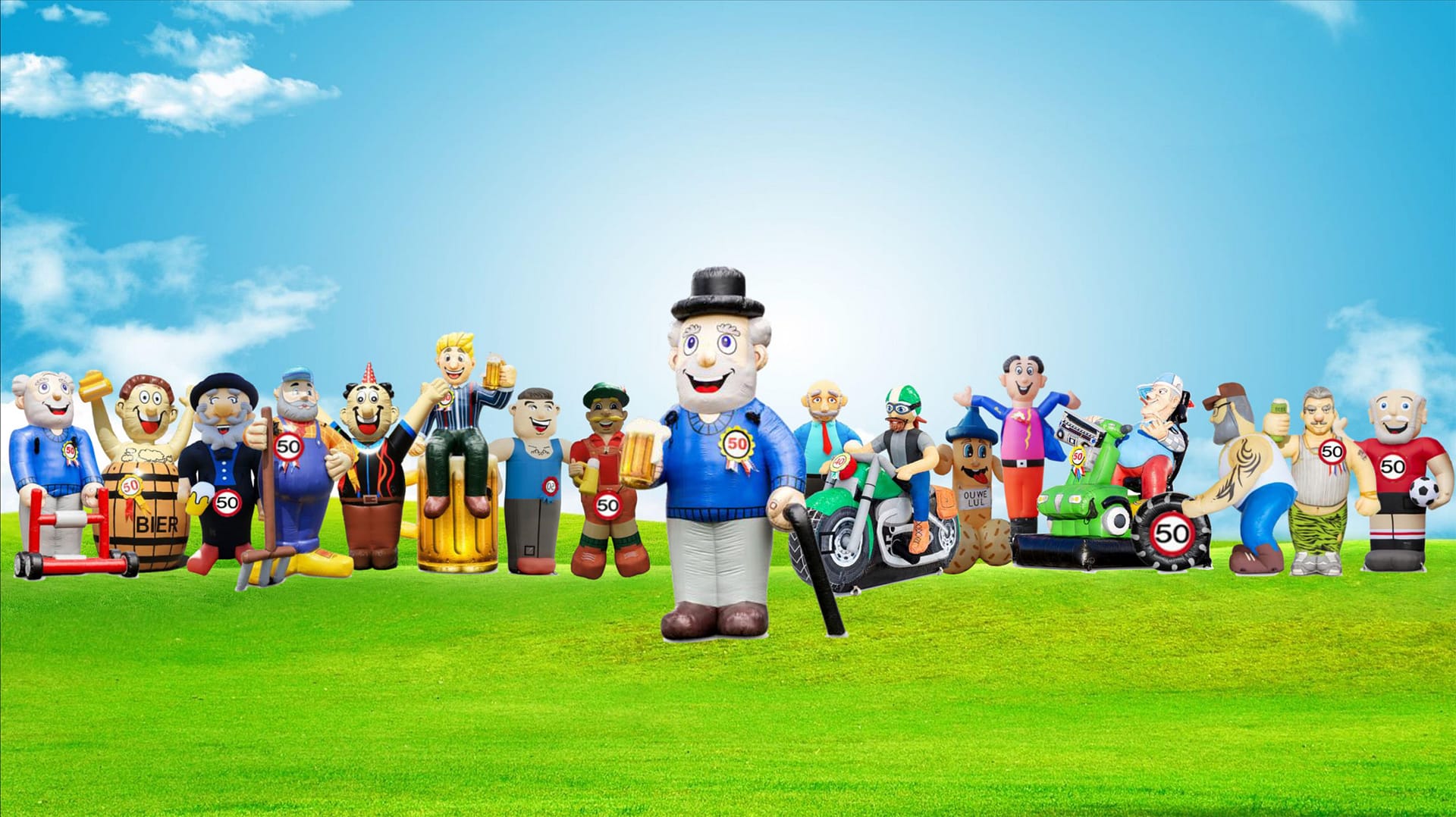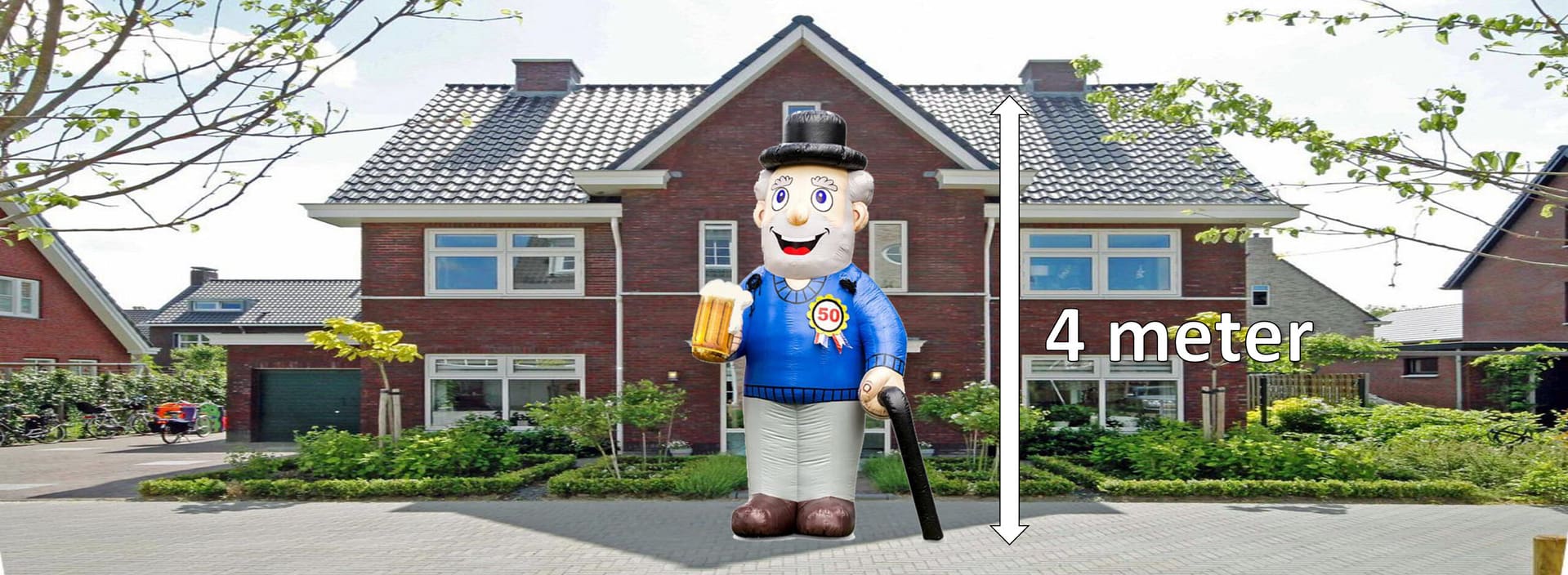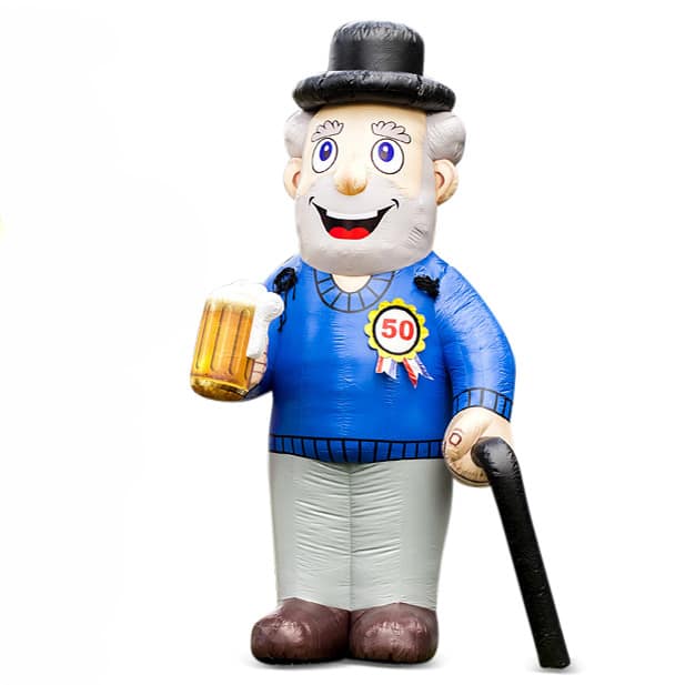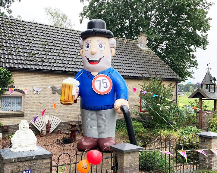 De Abraham Classic is een echte klassieker. Deze standaard Abraham hebben wij alleen wel in een modern jasje gestoken. In een grijze broek en een blauwe pullover staat deze 4 meter hoge abraham zich met zijn wandelstok en biertje al te begroeten voor zijn feestje.