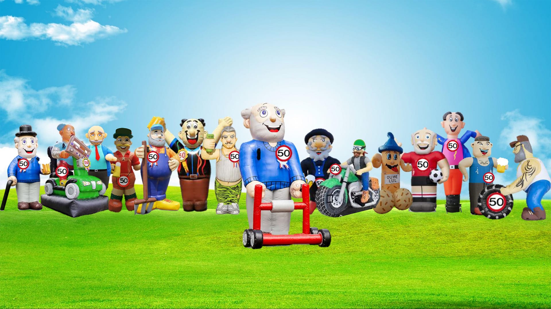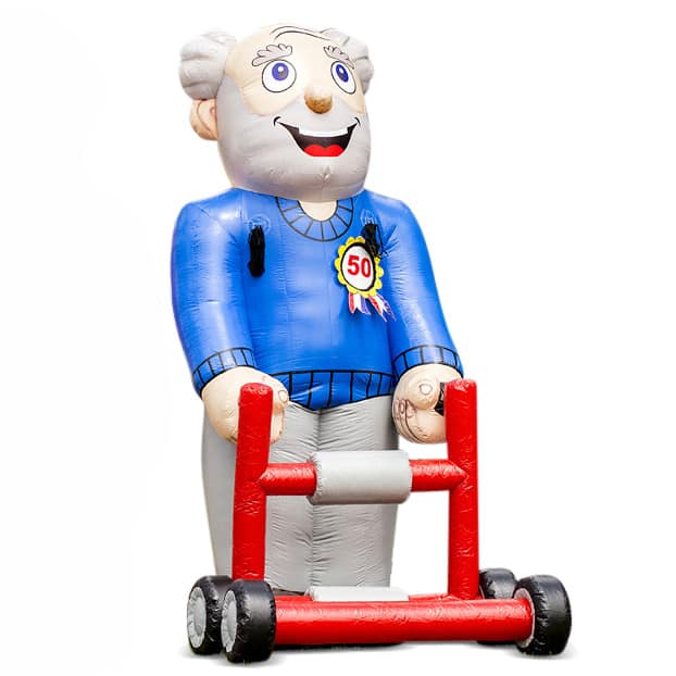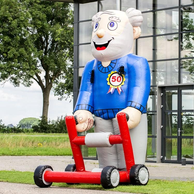 Augie Attracties & Events heeft namelijk een groot assortiment feestpoppen. Je kunt bij ons natuurlijk deze leuke Abraham met Rollator huren, maar wij verhuren nog 20 andere Abrahampoppen. Voor iedere jarige is er wel een passend typetje.Wij hebben verwisselbare leeftijdsborden. Daardoor onze opblaasbare poppen ook voor andere leeftijden geschikt. Al onze feestpoppen zijn van hoogwaardig PVC. Dit materiaal is namelijk sterker dan nylon. Daarnaast kan het doek full-colour geprint worden. Hierdoor zijn de kleuren fel en helder en komt het 3D effect goed naar voren. Een Abraham met Rollator huren doe je dus bij Augie.