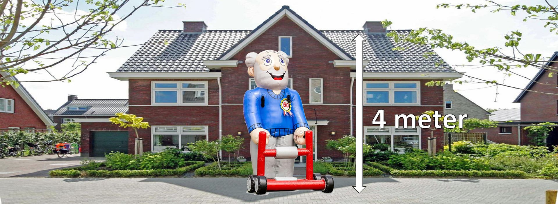Dit is een veel voorkomende vraag, omdat veel klanten geen idee hebben hoe groot het pakket is. Klanten denken dat ze een aanhanger mee moeten nemen, maar dat is niet nodig. De Abraham met Rollator zit in een handige transportzak. Daardoor past deze feestpop in iedere auto. Uiteraard leveren wij ook de blower, het gewenste leeftijdenbord en de haringen.