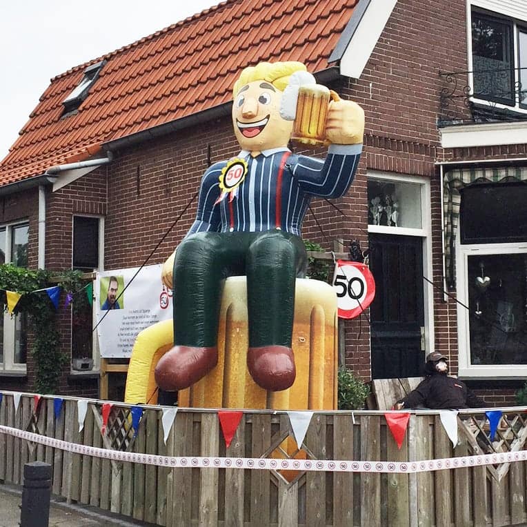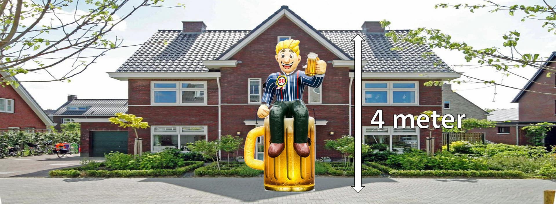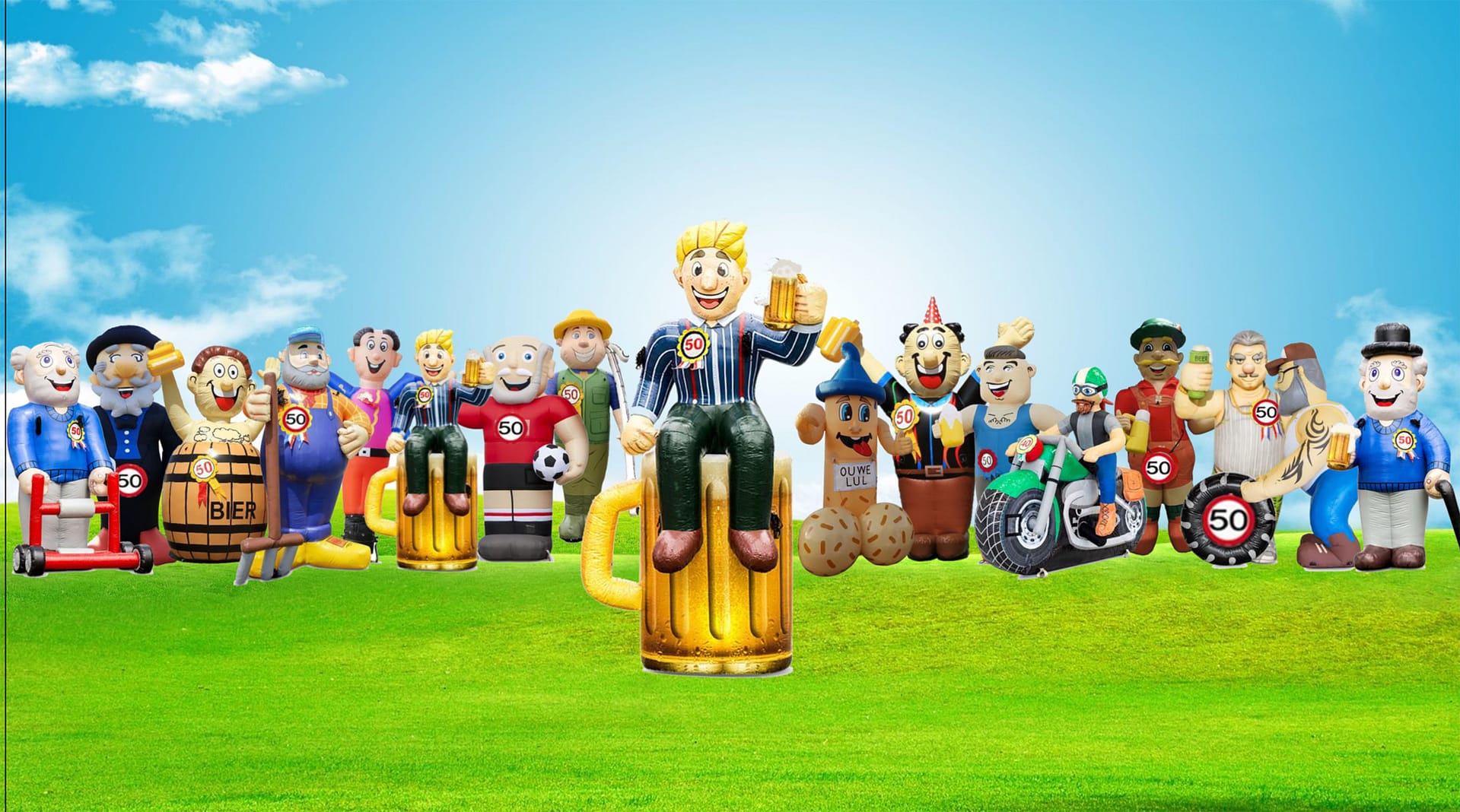 Speciaal voor die mannen, die graag een lekker biertje drinken is de Abraham op bierglas één van de leukste modellen van dit moment. Deze vrolijke vent zit heerlijk te genieten bovenop het bierglas. Met een hoogte van 4 meter is deze opblaasbare feestpop te zien in de hele straat.