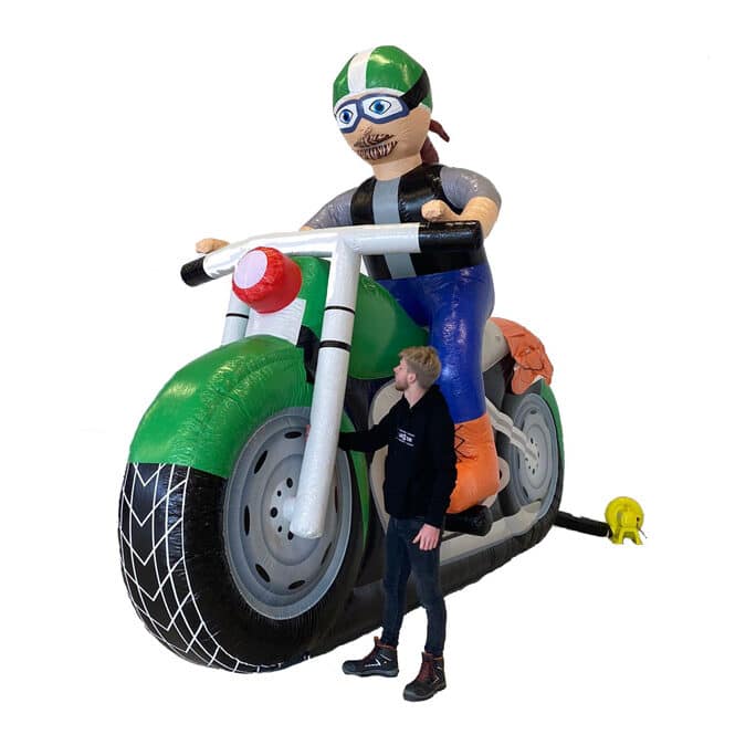 Deze Abraham op Motor XXL is een gigantisch! Het is de perfecte pop voor een stoere motorrijder. de Abraham op motor XXL zit op een prachtige, blinkende, groene caféracer. De motor lijkt ook wel iets op een Norton of Kawasaki. Ken jij een jarige motorfreak? Huur dan snel deze supergave Opblaaspop Motorrijder.