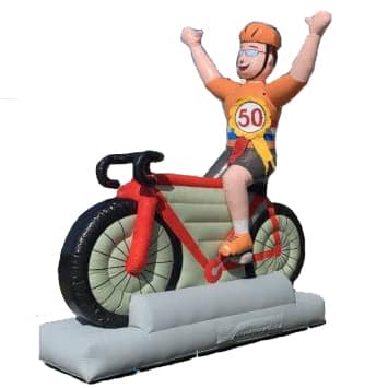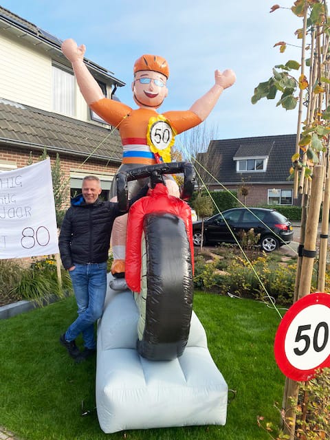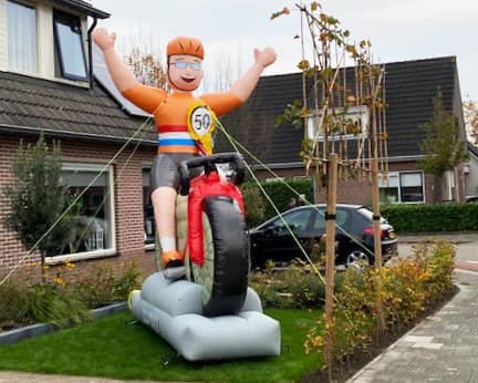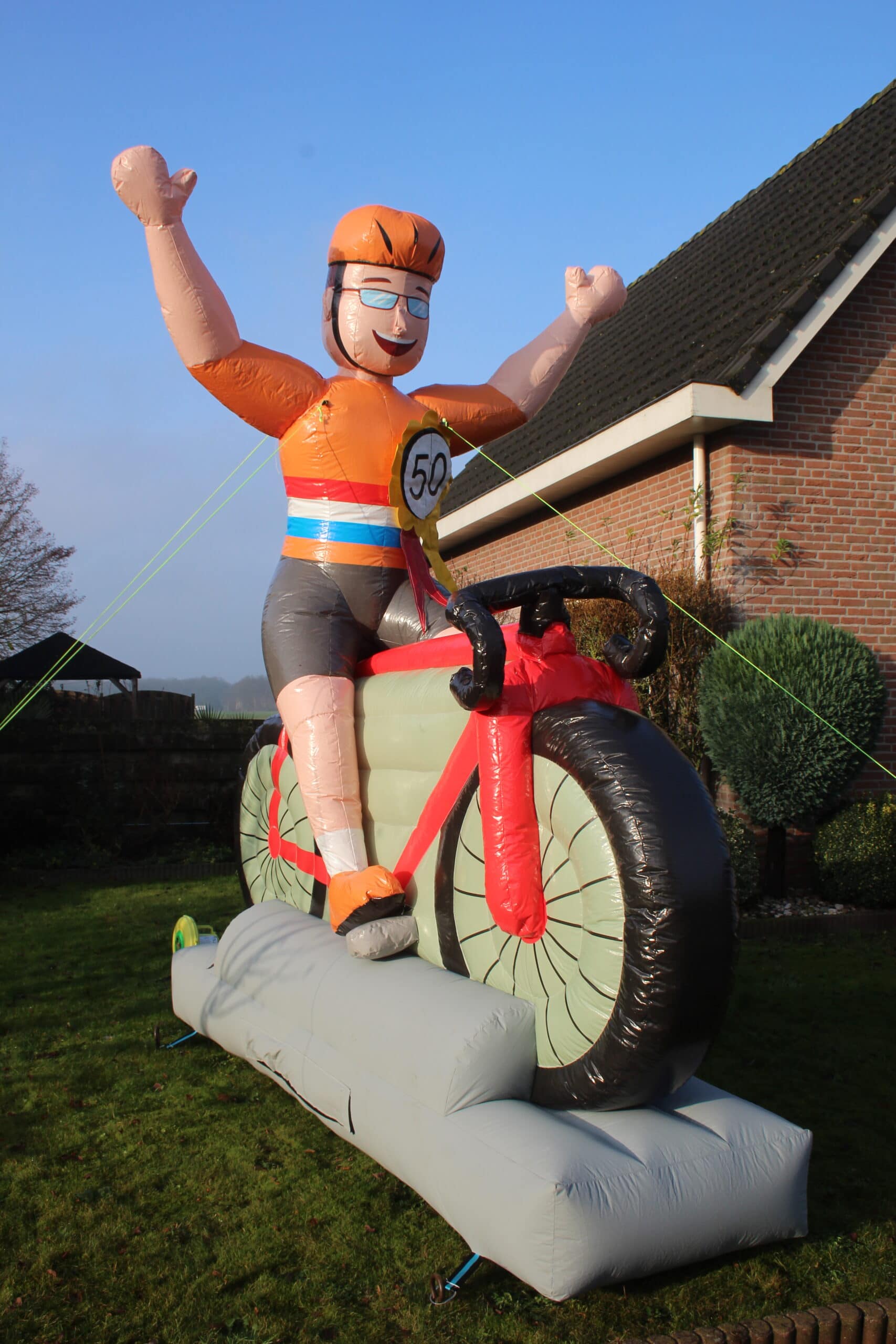 Onze Abraham op racefiets is afbeeld in zijn meest glorieuze moment. Met andere woorden: met zijn beide armen in de lucht wanneer hij als eerste over de finish komt. Hij is de winnaar en kan gehuldigd worden. Ook een 50 jarige mag worden gehuldigd. Verras de jarige met deze unieke opblaasbare Abraham Wielrenner in de tuin en een mooie bijpassende XXL Gevelvlag voor een jarige abraham.