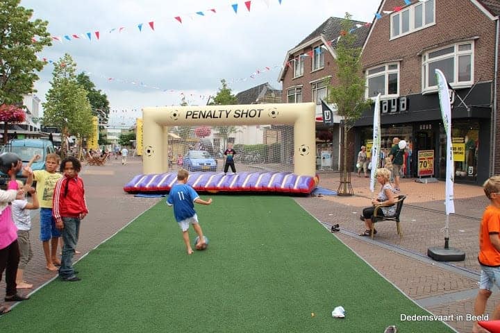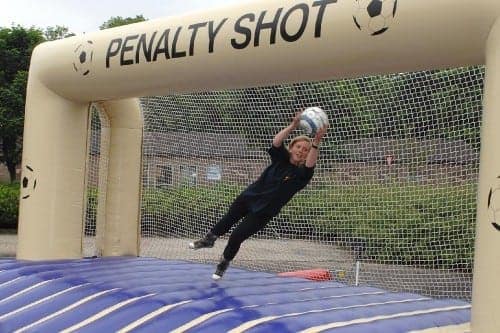 Bij dit opblaasbaar doel kunnen de keepers echt lekker naar de bal duiken.