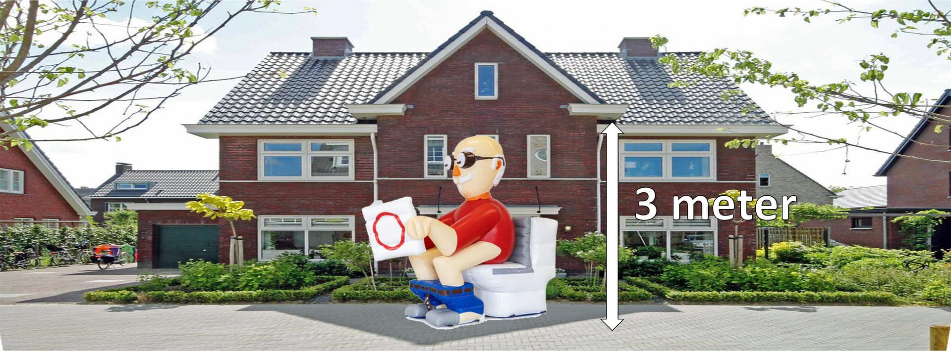 Zit de jarige urenlang met zijn krant op de wc? Dan is dit dé perfecte verjaardagspop. Deze Feestpop op WC huren is een goed idee. Deze hilliarische verjaardsagspop is 3 meter hoog. Daardoor is de deze ludieke pop goed zichtbaar voor de buren. Wij verhuren onze feestpoppen met verwisselbare leeftijdsborden. Daardoor kun je de Feestpop op WC huren voor iedere leeftijd. Bijvoorbeeld voor een jarige van 30, 35 of 40 jaar. Maar ook 37, 42 of 67 jaar is mogelijk. Kortom: heb schijt aan je leeftijd en huur deze leuke pop.