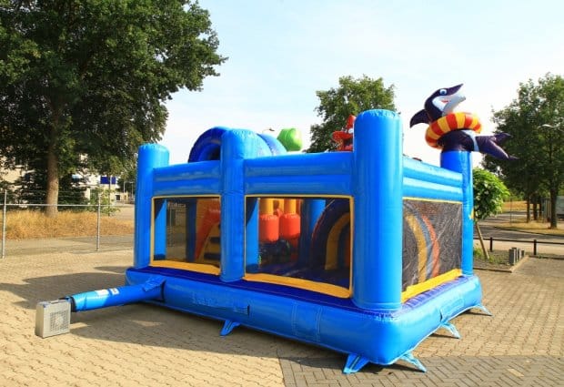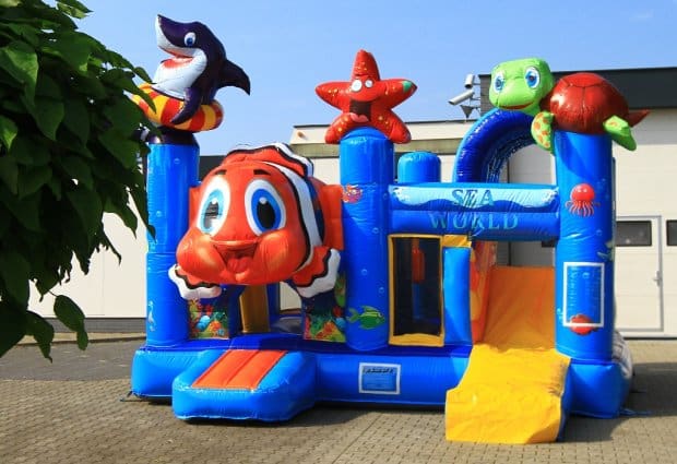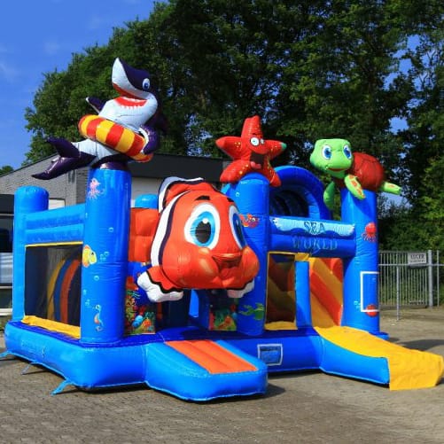 De multiplay springkussens zijn de meest uitgebreide springkussens uit ons assortiment. Wij verhuren maar liefst 5 verschillende soorten. De Multiplay Sealife is voorzien van vrolijke oceaan dieren. Zo kruip je bijvoorbeeld onder een grote opblaasbare vis naar binnen, en vind je op de pilaren een grappige haai, zeester en een schattige zeeschildpad. Zowel de binnen- als buitenkant zijn voorzien van mooie tekeningen, zodat kinderen nog meer plezier hebben op dit geweldige springkussen!