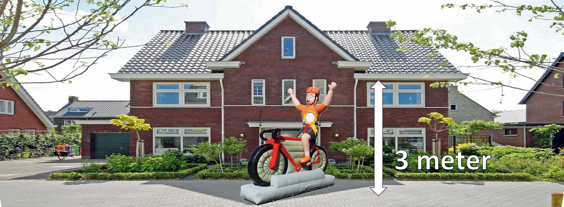 Is de jarige een fanatieke wielrenner? Dan moet je onze Opblaaspop Man op Racefiets huren. Deze 4 meter hoge verjaardagspop is dé perfecte pop voor iedere sportieve of recreatieve wielrenner. De Man op Racefiets is geschikt voor iedere leeftijd. Wij hebben verwisselbare leeftijdsborden en daarmee kunnen wij iedere leeftijd creëren. Bijvoorbeeld voor een Abraham, maar ook voor een jargie die 23, 30, 38 of 66 jaar wordt. De gewenste leeftijd kun je aan ons doorgeven.