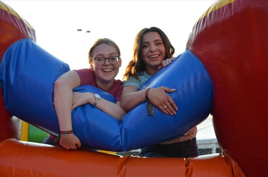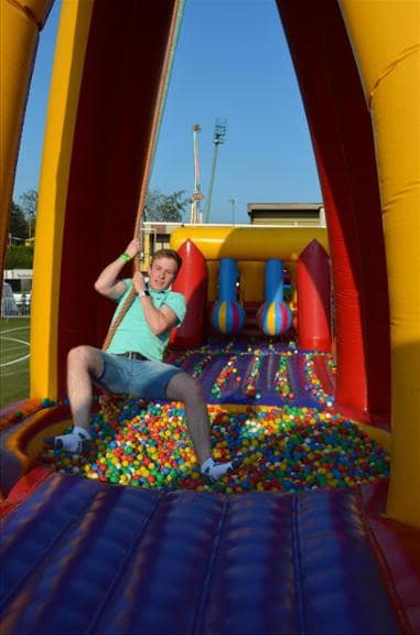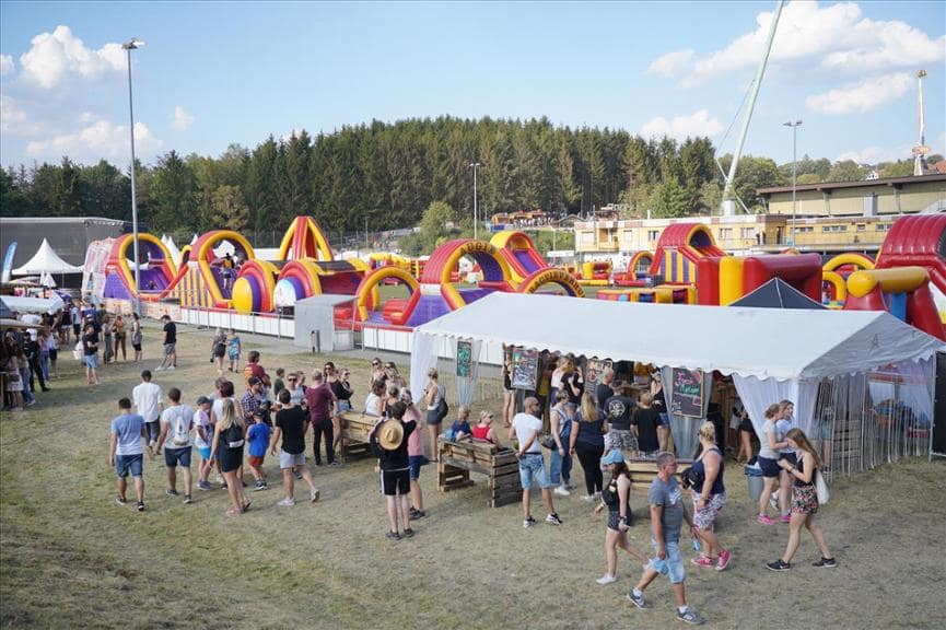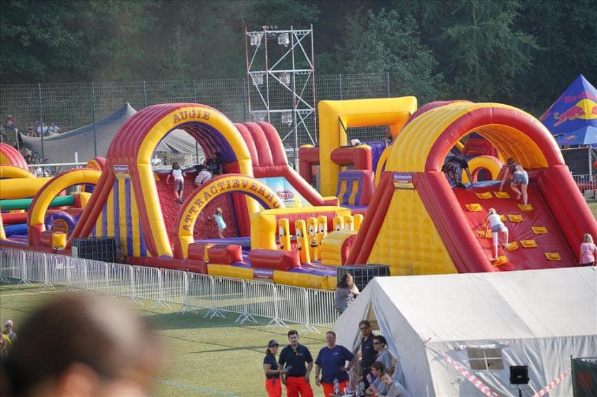 Voor de totale stormbaan zijn 14 personen nodig voor toezicht en begeleiding. Immers is de doorstroming op een baan als deze van groot belang om zoveel mogelijk (betalende) deelnemers de kans te geven om zich lekker uit te leven. Deze lange stormbaan is in Lüdenscheid begeleidt door 6 personen van Augie en 8 personen van de klant. Ikzelf heb tijdens het begeleiden van de baan genoten van het grote enthousiasme van de vele festivalgangers tussen de 18 en 50 jaar. Velen worden weer even helemaal “kind”.