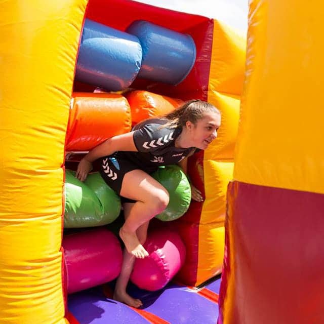 De Take Out Stormbaan is een erg populaire stormbaan. Deze 17 meter lange survivalbaan zit vol uitdagende obstakels. Als eerste kruip je door de mouse-trap. Daarna klim je via het net op de steile helling en glij ja door de tunnels naar beneden. Ontwijk de ballen en storm af op de squeezer. Welk team is het snelst en komt als eerste over de finish?