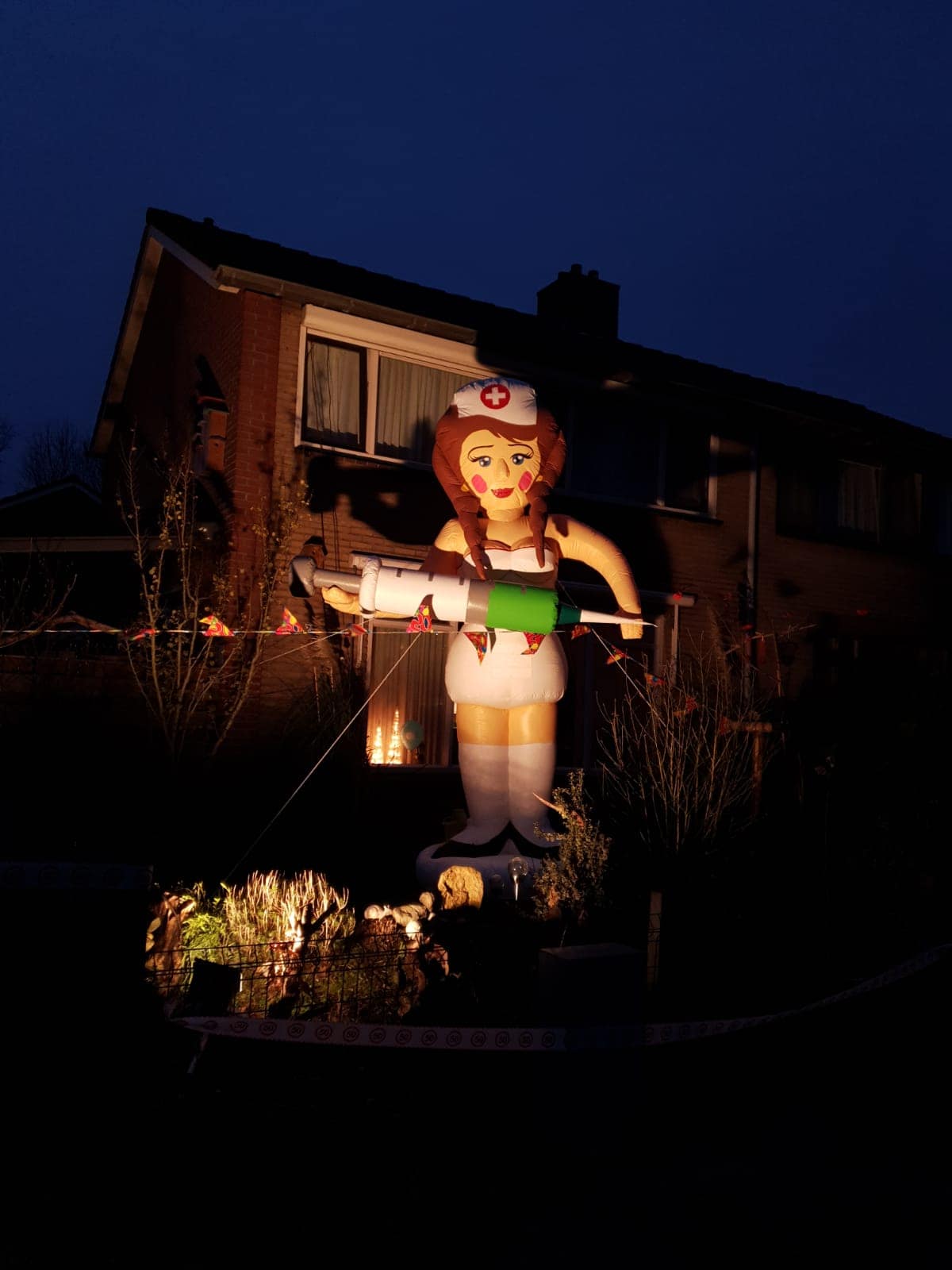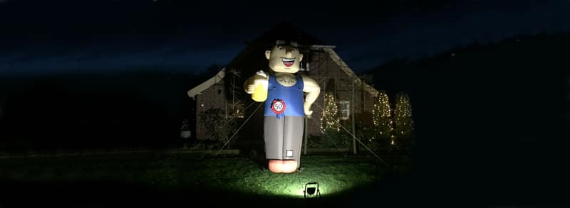 Ik kan me voorstellen dat je je afvraagt hoe het eindresultaat er in het donker uitziet. Dat kun je zien op de onderstaande foto. Deze foto ontvingen wij van een tevreden klant. Zij huurde voor haar man de Abraham Voetballer. Met de extra verlichting staat deze Abraham in het donker mooi in de schijnwerpers. Ik weet zeker dat ze hiermee goed heeft gescoord bij haar man.