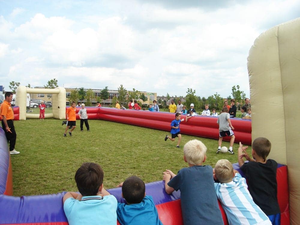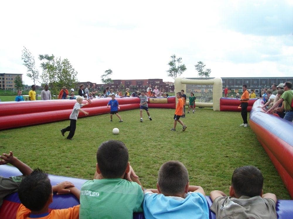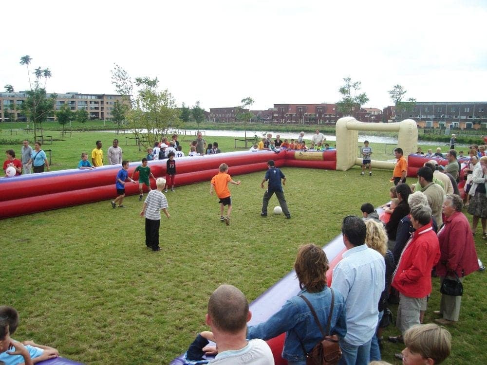 De Voetbalboarding van Augie Verhuur heeft afmetingen van 10 bij 20 meter en de randen zijn 1,2 meter hoog.